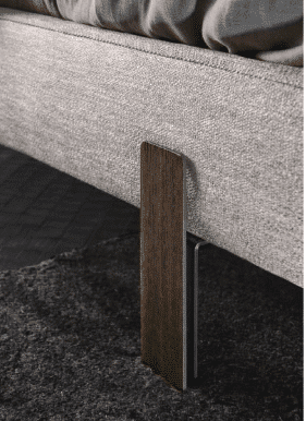 • Frame en Hoofdeinde: Het frame rond het hoofdeinde is een opvallend kenmerk, met een slanke aluminium vorm, bekleed met hout. Het beschikt over bruin gelakte randen en structuur, wat zorgt voor een elegante uitstraling.