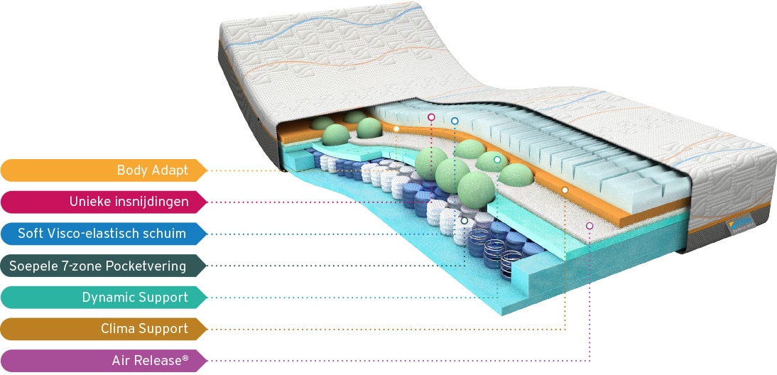 In de Cool Motion Hybrid Premium 8 zijn de allernieuwste technieken op slaapgebied verwerkt. De 7-zones pocketvering zorgt voor ondersteuning tot in detail. De schuimbollen die in het matras zijn verwerkt zorgen ervoor dat je goed kunt bewegen tijdens je slaap en dankzij het visco-elastisch schuim in de bovenlaag vormt het matras zich exact naar je lichaam.
